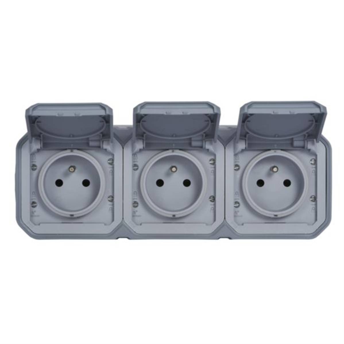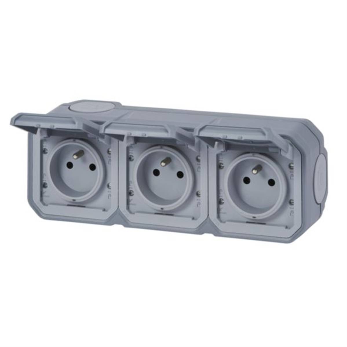 Triple prise de courant Plexo précâblée horizontale 16A 250V, livré complet avec boîtier saillie - Gris - Legrand 069763L