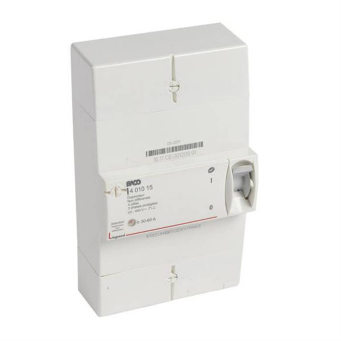 • Disjoncteur d'abonné Basse Tension BACO tétrapolaire 250V~ à 400V~ pour tarif à puissance limitée (tarif bleu) de 3kVA à 36kVA - Intensité nominale: 60A