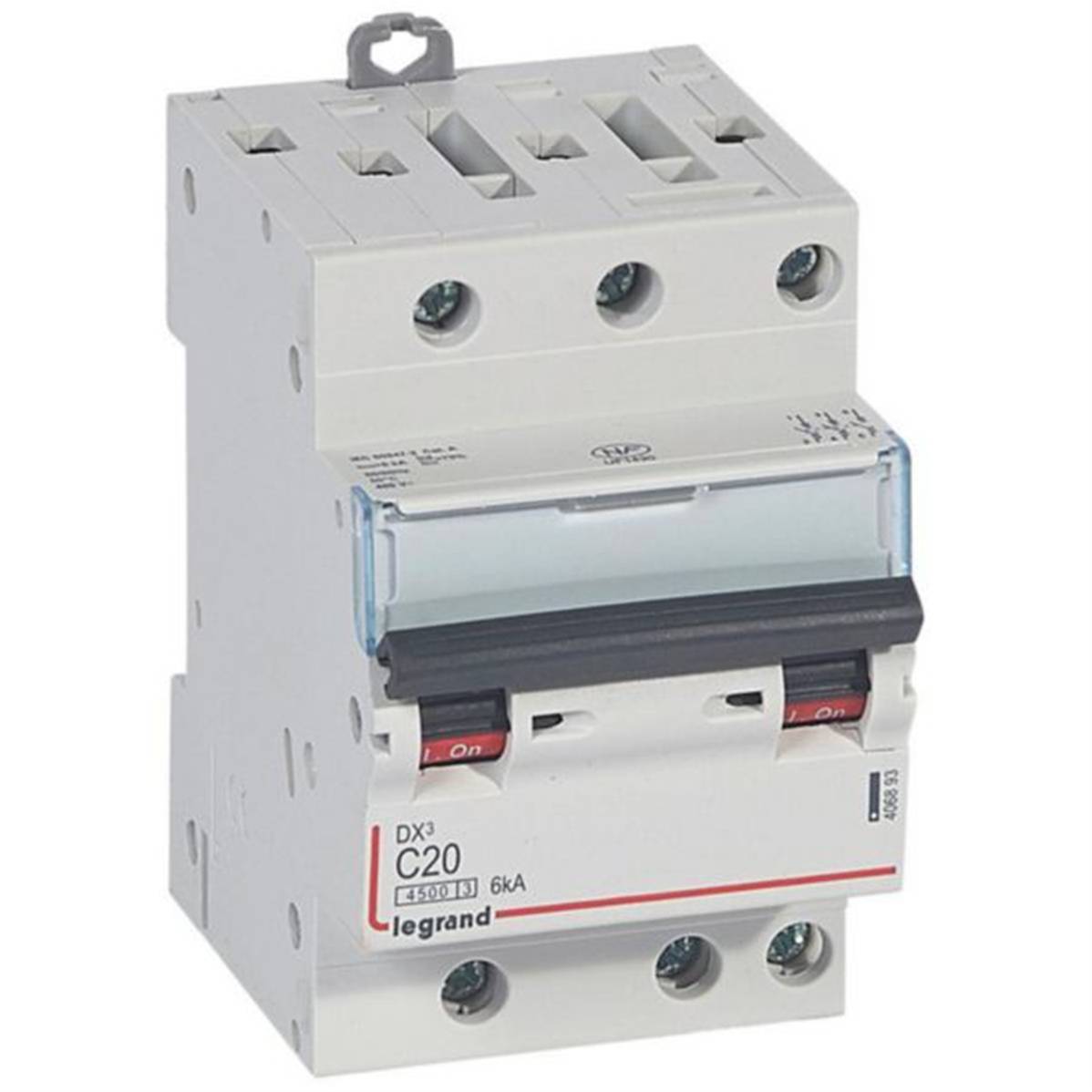 Disjoncteur DX³4500 6kA arrivée haute et sortie basse par borne à vis - tripolaire 400V~ 20A courbe C - 3 modules - Legrand 406893