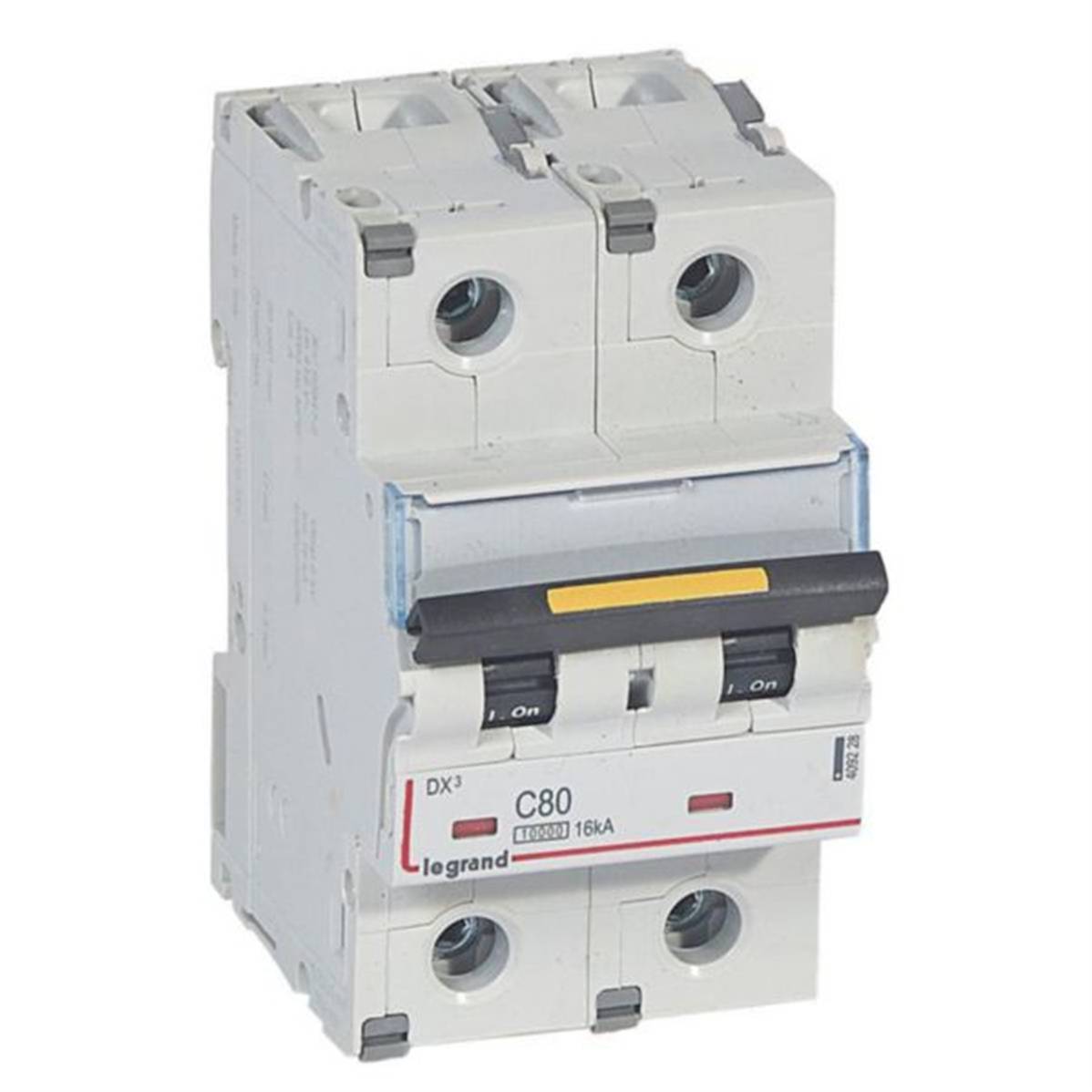 Disjoncteur DX³10000 16kA arrivée haute et départ bas à vis 2P 230V~ à 400V~ - 80A - courbe C - 3 modules - Legrand 409228