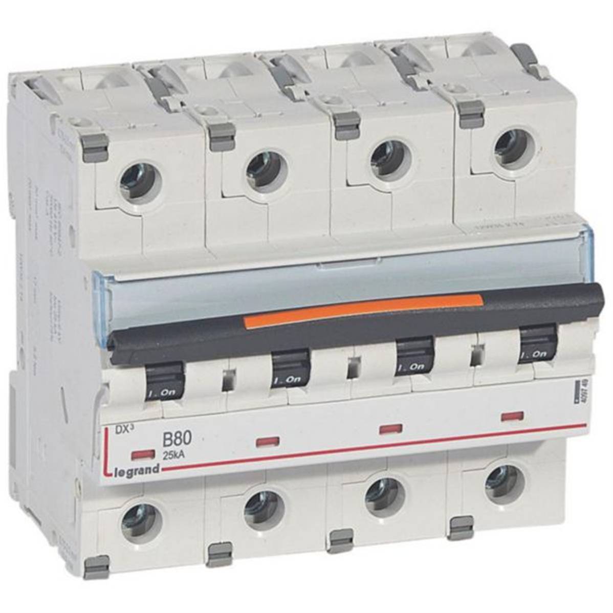 Disjoncteur DX³ 25kA arrivée haute et départ bas à vis 4P 400V~ - 80A - courbe B - 6 modules - Legrand 409749