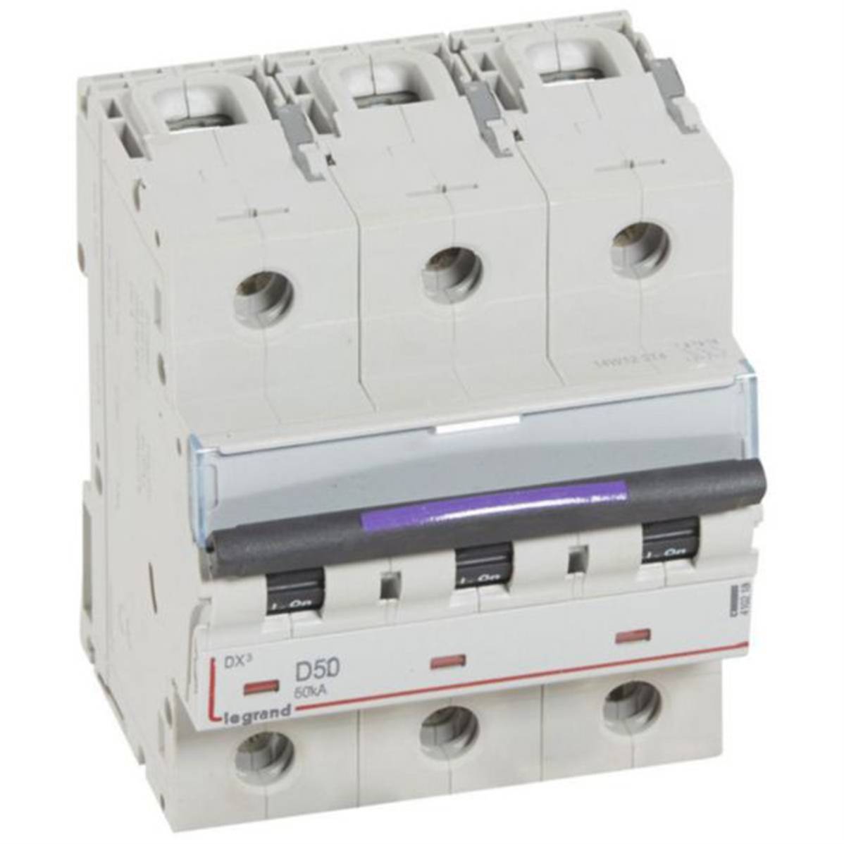 Disjoncteur DX³ 50kA arrivée haute et départ bas à vis 3P 400V~ - 50A - courbe D - 4,5 modules - Legrand 410218