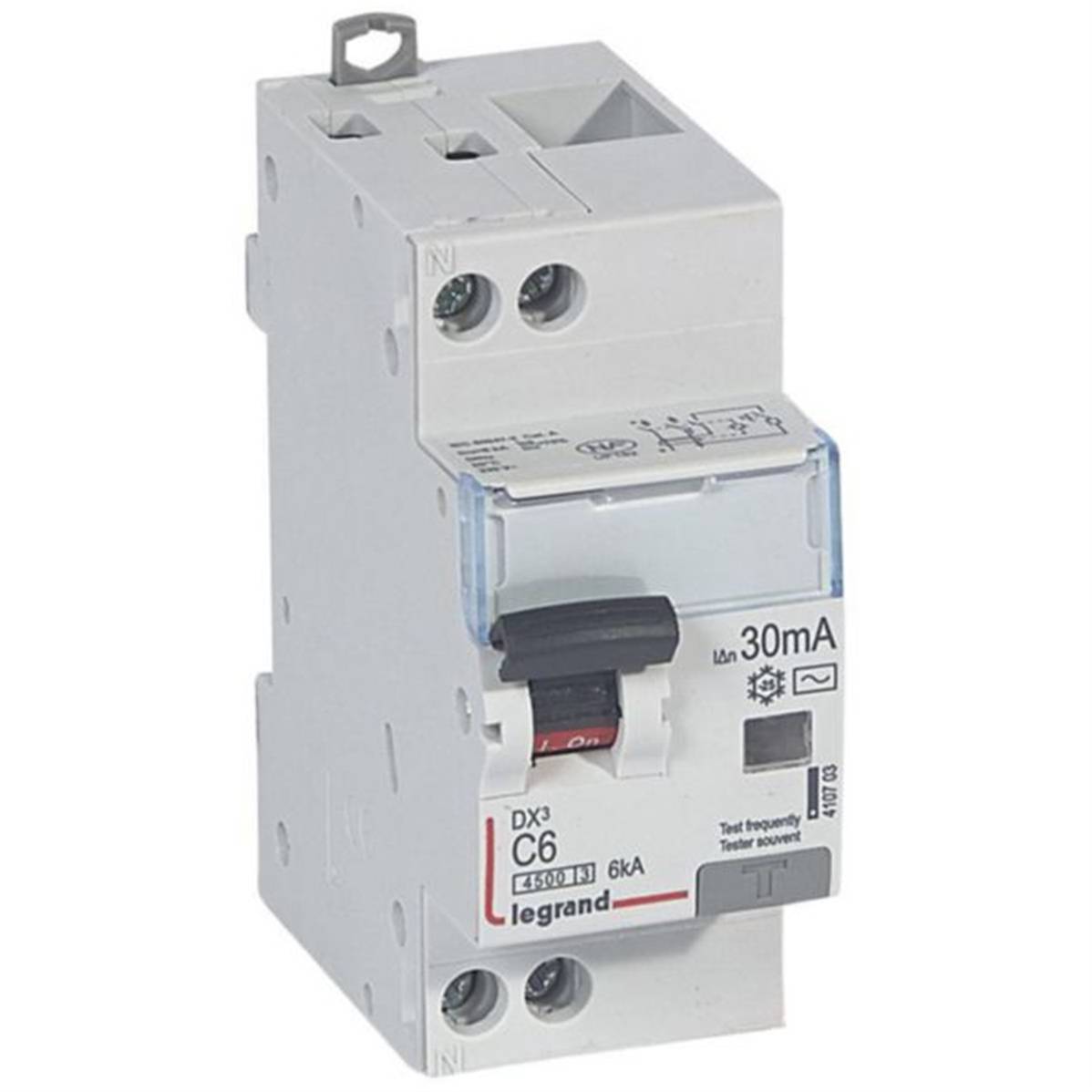 Disjoncteur différentiel DX³4500 arrivée haute et départ bas à vis U+N 230V~ - 6A typeAC 30mA - courbe C - 2 modules - Legrand 410703