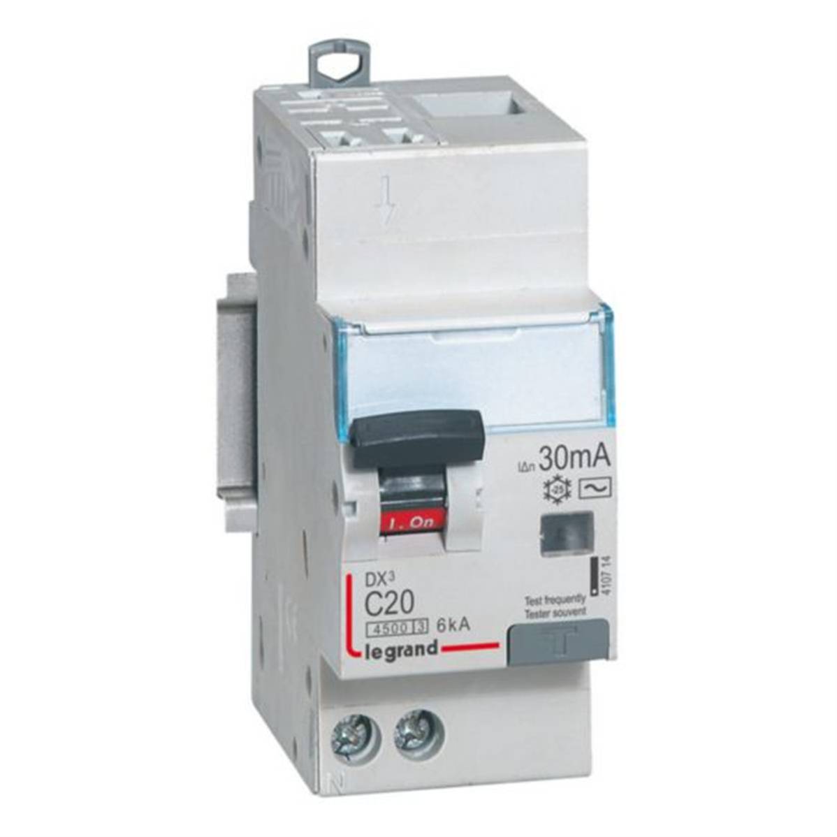 Disjoncteur différentiel DX³4500 arrivée haute automatique et départ bas à vis U+N 230V~ - 20A typeAC 30mA - 2 modules - Legrand 410714
