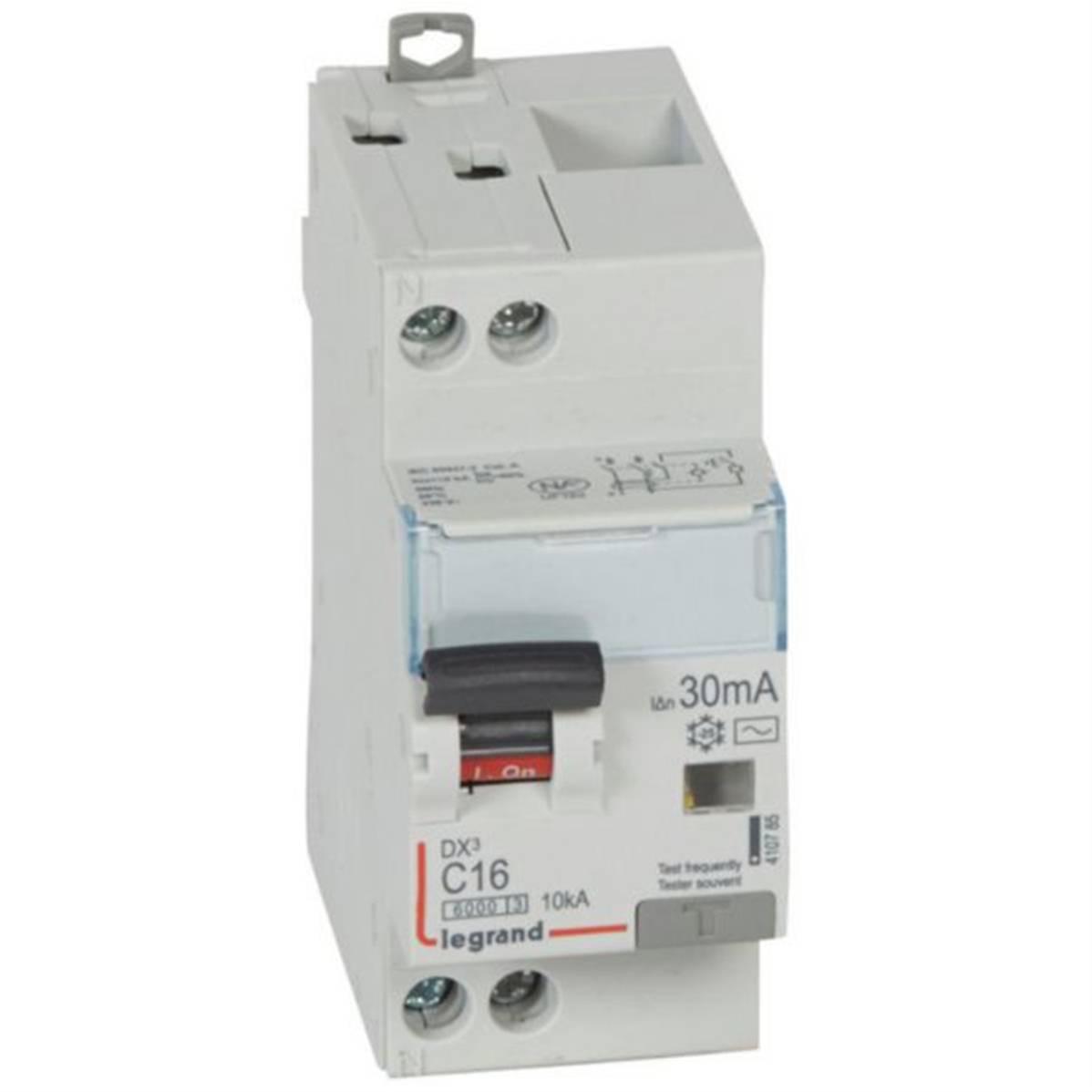 Disjoncteur différentiel monobloc DX³6000 10kA arrivée haute et départ bas à vis U+N 230V~ - 16A - typeAC 30mA - Legrand 410785