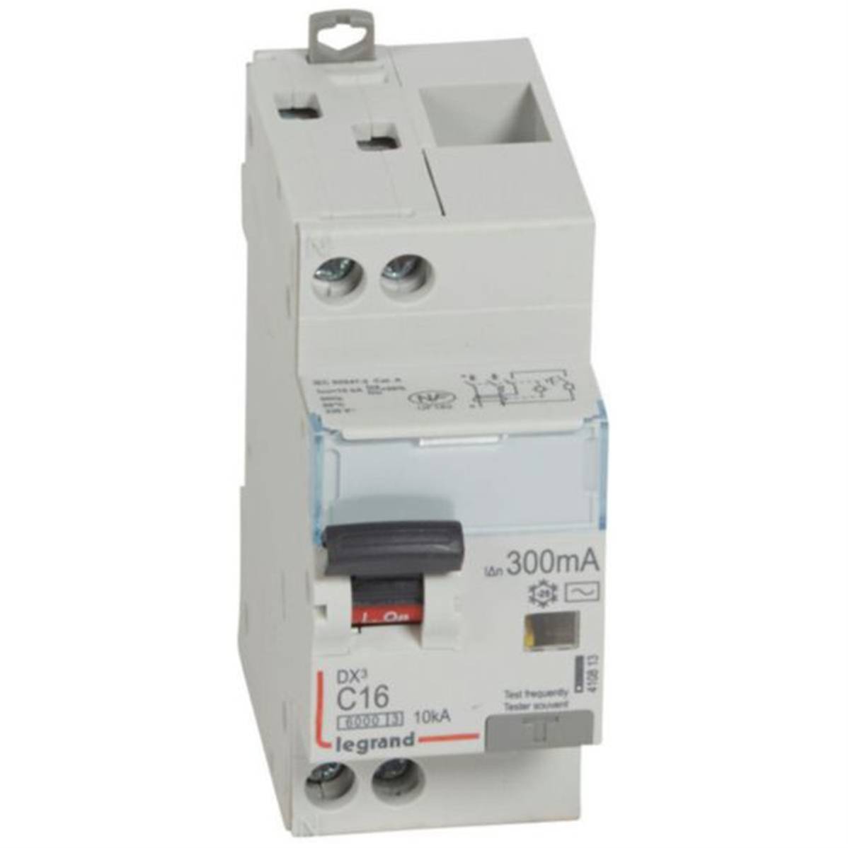 Disjoncteur différentiel monobloc DX³6000 10kA arrivée haute et départ bas à vis U+N 230V~ - 16A - typeAC 300mA - Legrand 410813