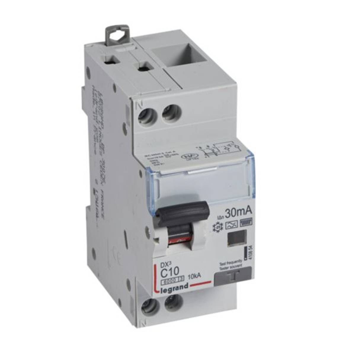 Disjoncteur différentiel monobloc DX³6000 10kA arrivée haute et départ bas à vis U+N 230V~ - 10A - typeF 30mA - Legrand 410854