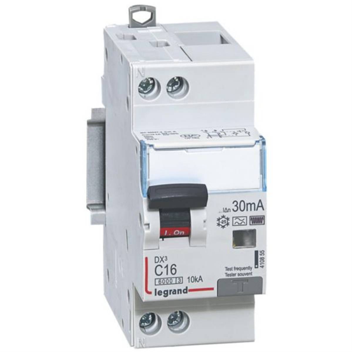 Disjoncteur différentiel monobloc DX³6000 10kA arrivée haute et départ bas à vis U+N 230V~ - 16A - typeF 30mA - Legrand 410855