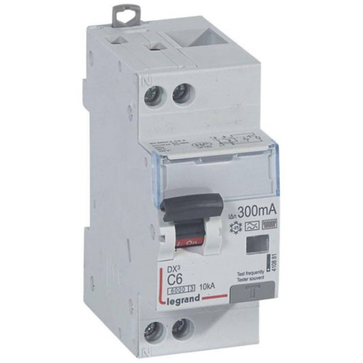 Disjoncteur différentiel monobloc DX³6000 10kA arrivée haute et départ bas à vis U+N 230V~ - 6A - typeF 300mA - Legrand 410881