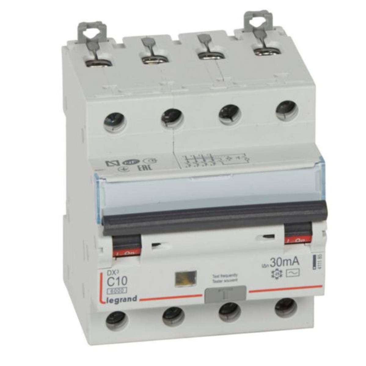 Disjoncteur différentiel monobloc DX³6000 10kA arrivée haute et départ bas à vis 4P 400V~ - 10A - typeAC 30mA - Legrand 411185