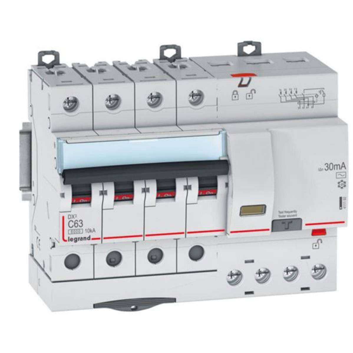 Disjoncteur différentiel monobloc DX³6000 10kA arrivée haute et départ bas à vis 4P 400V~ - 63A - typeAC 30mA - Legrand 411192